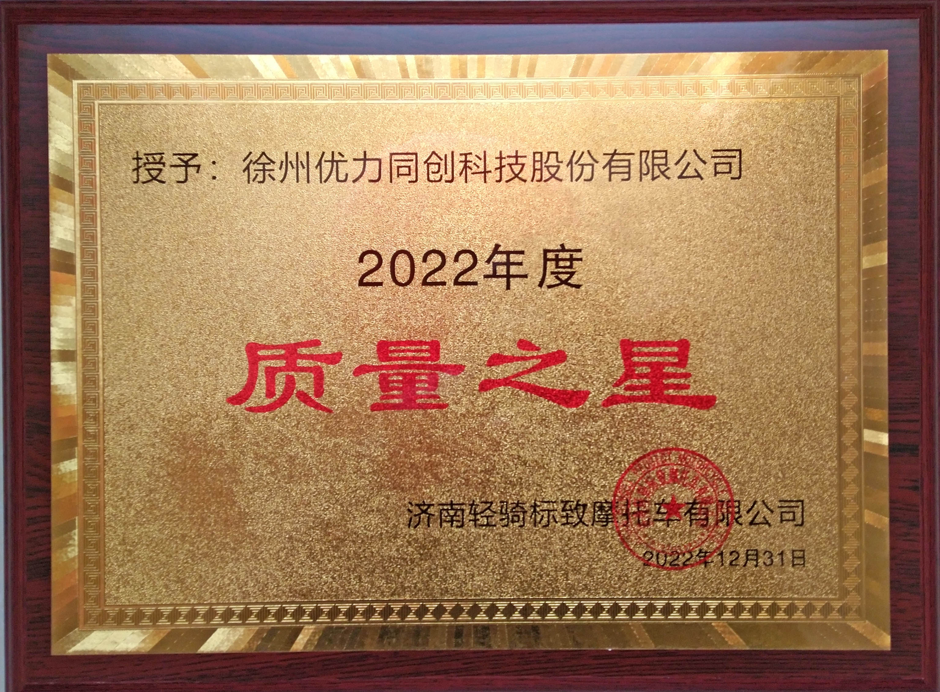 2022年12月31日,獲濟(jì)南輕機(jī)標(biāo)志摩托車有限公司頒發(fā)質(zhì)量之星榮譽(yù)證書(shū),是對(duì)我公司一年以來(lái)的工作肯定,公司將繼續(xù)做好產(chǎn)品、好質(zhì)量、好服務(wù),持續(xù)為客戶提供高價(jià)值產(chǎn)品與服務(wù)。